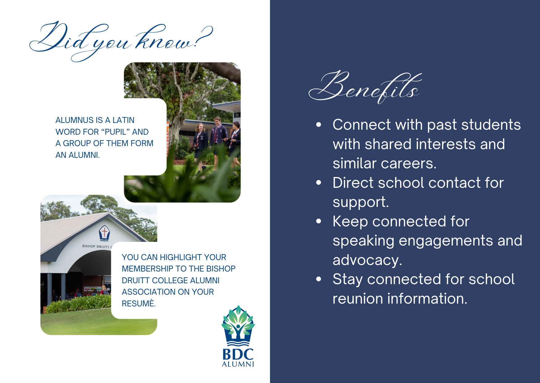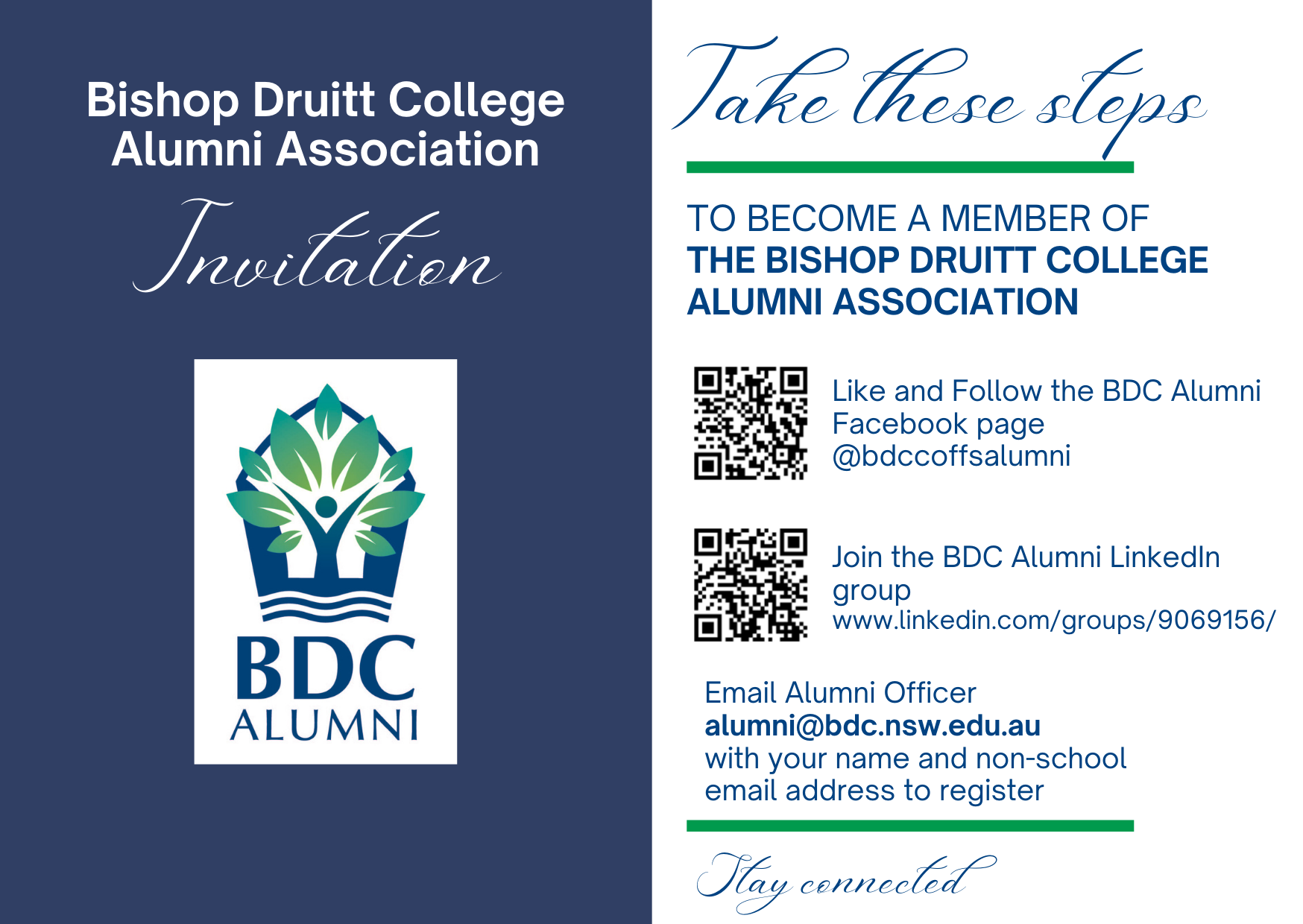 The Bishop Druitt College Alumni Association and the business community provide an opportunity to maintain and grow connections through the school. The BDC Alumni Officer maintains a database of former students, organises social events for alumni to attend, and helps make business connections, not only in Coffs Harbour but around the world.