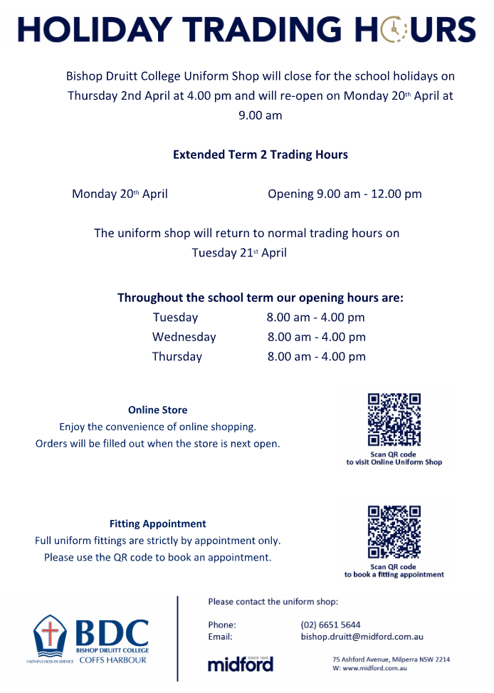 Appointments are required during this holiday time. Your appointment can be organised by calling the uniform shop on 66515 644 Ext 238 or by email bishop.druitt@midford.com.au
