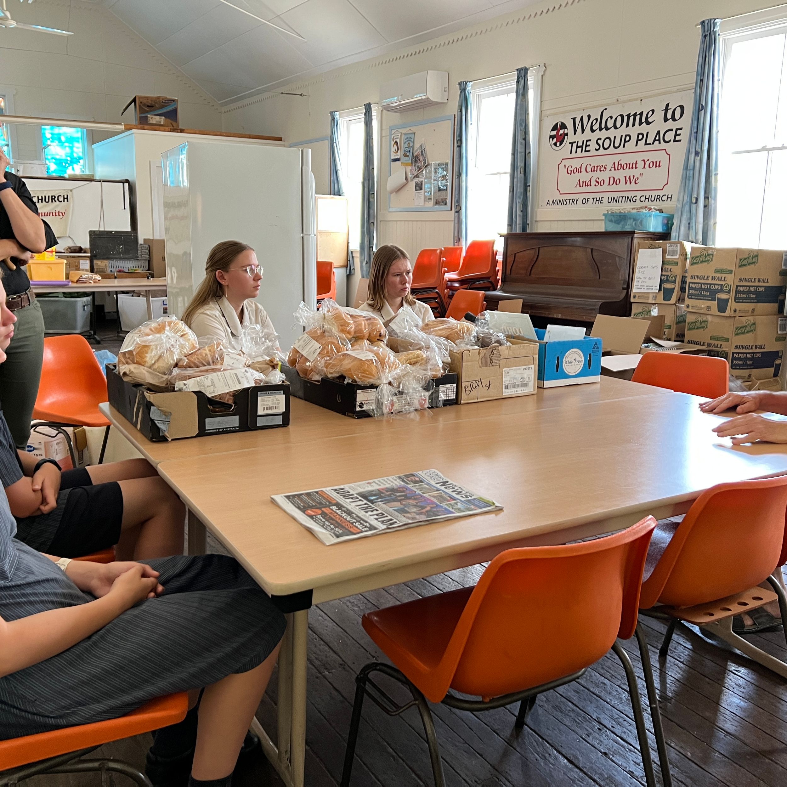 Four Bishop Druitt College students, Kye Becton Year 6, Adelaide Robinson Year 6, Sadie Williams Year 12, and Matilda Watson Year 12 visited the Coffs Harbour Uniting Church Soup Kitchen on Monday 28 November to help prepare and serve food to people in need as a key part of their service learning program at the college.