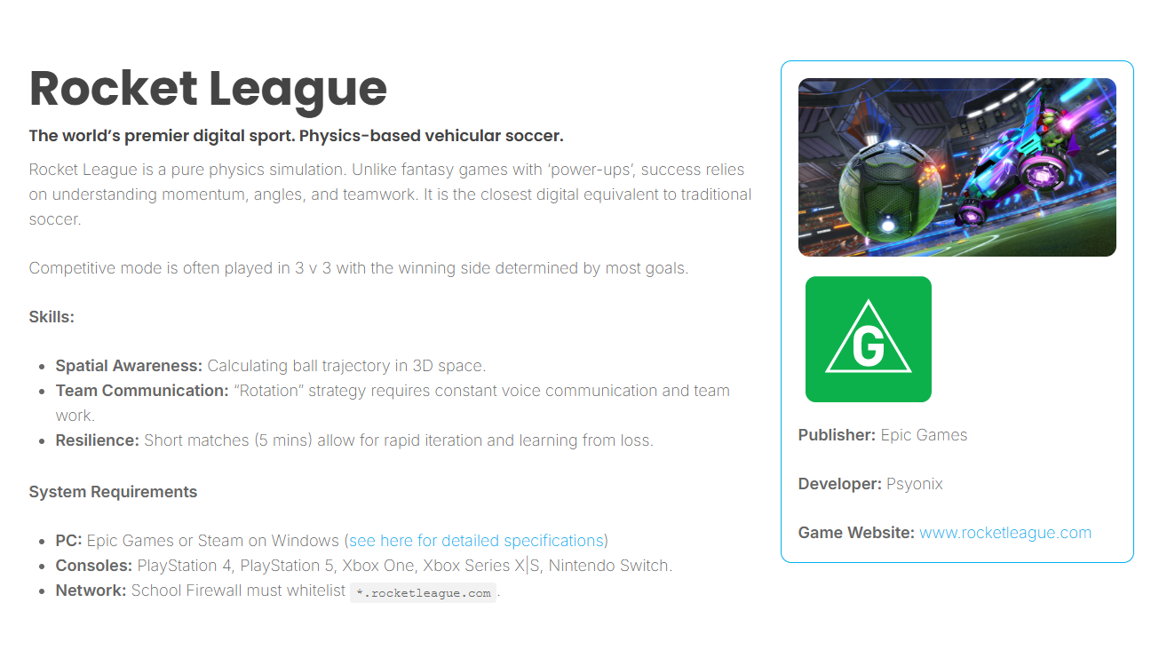 Nominations for Term 2's team will go out soon, so look out for School Box messages. Also, there will be an in school Rocket League 2 v 2 competition for Term 2 in the iHub. Stay tuned for further information.