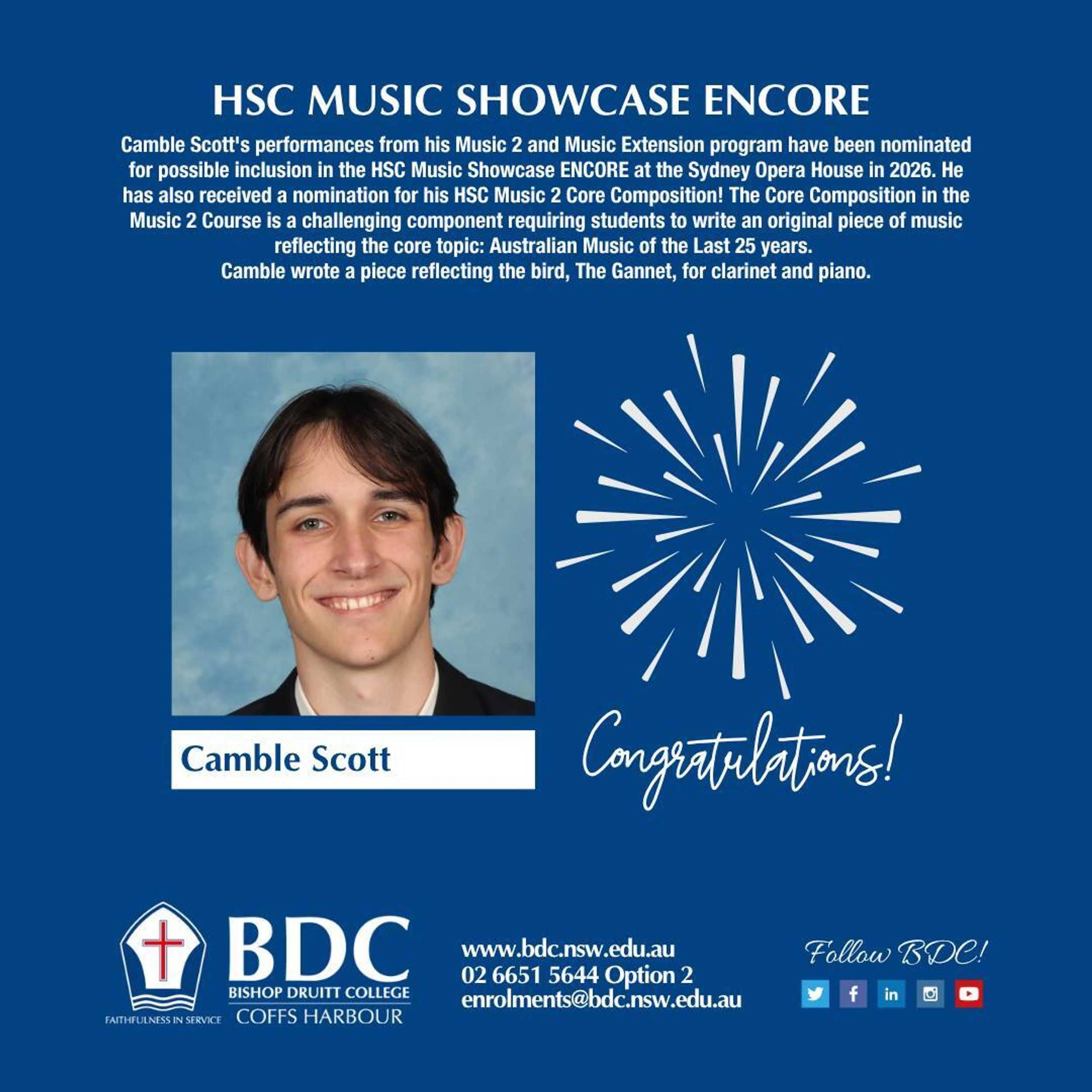 Congratulations to Camble Scott, whose HSC Music 2 Core Composition has been nominated for possible inclusion in ENCORE, the HSC Music Showcase to be held at the Sydney Opera House on Monday 2 March 2026. In addition, at the end of last term, Camble’s HSC Music 2 and Music Extension Performance programs were also nominated for ENCORE.