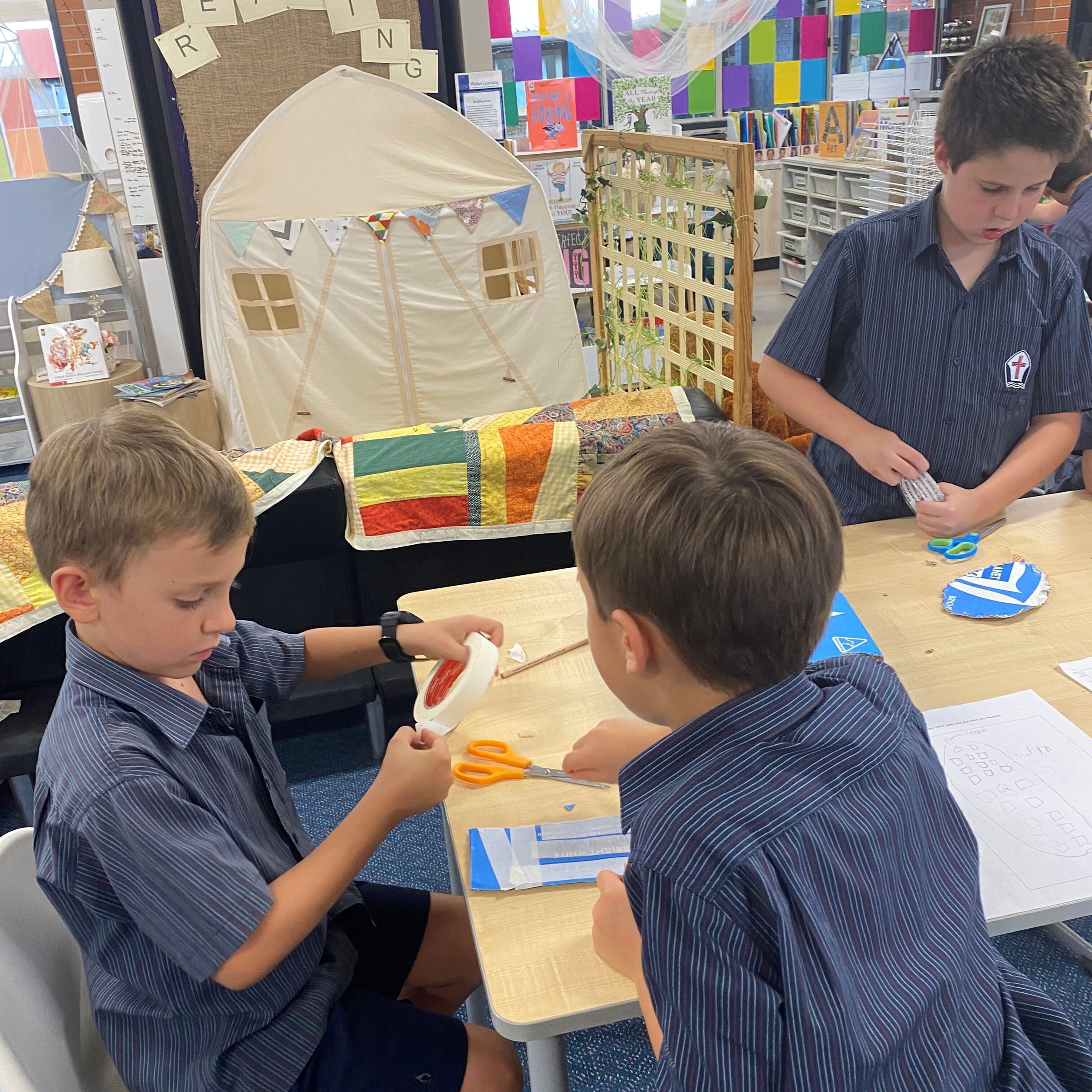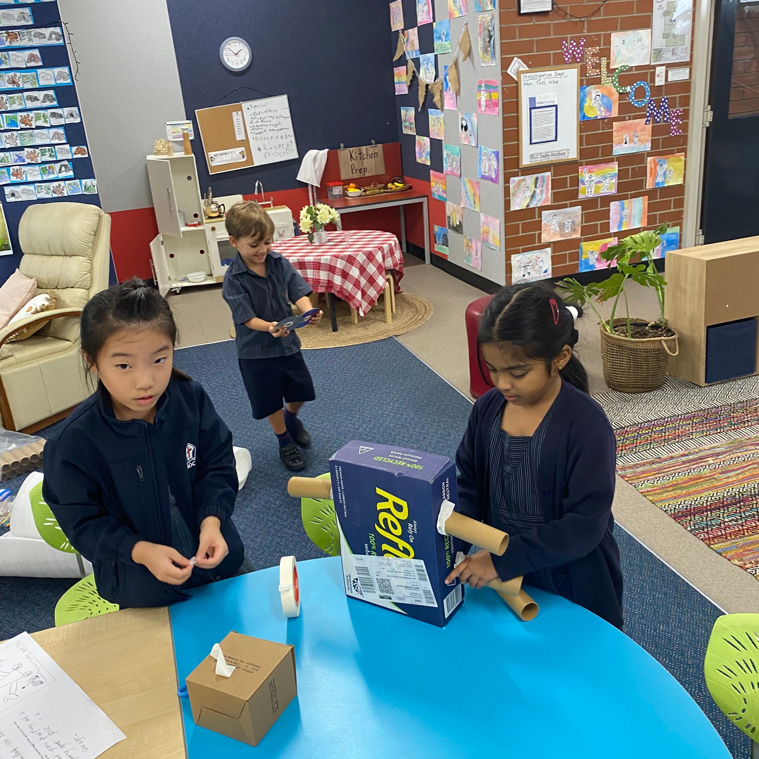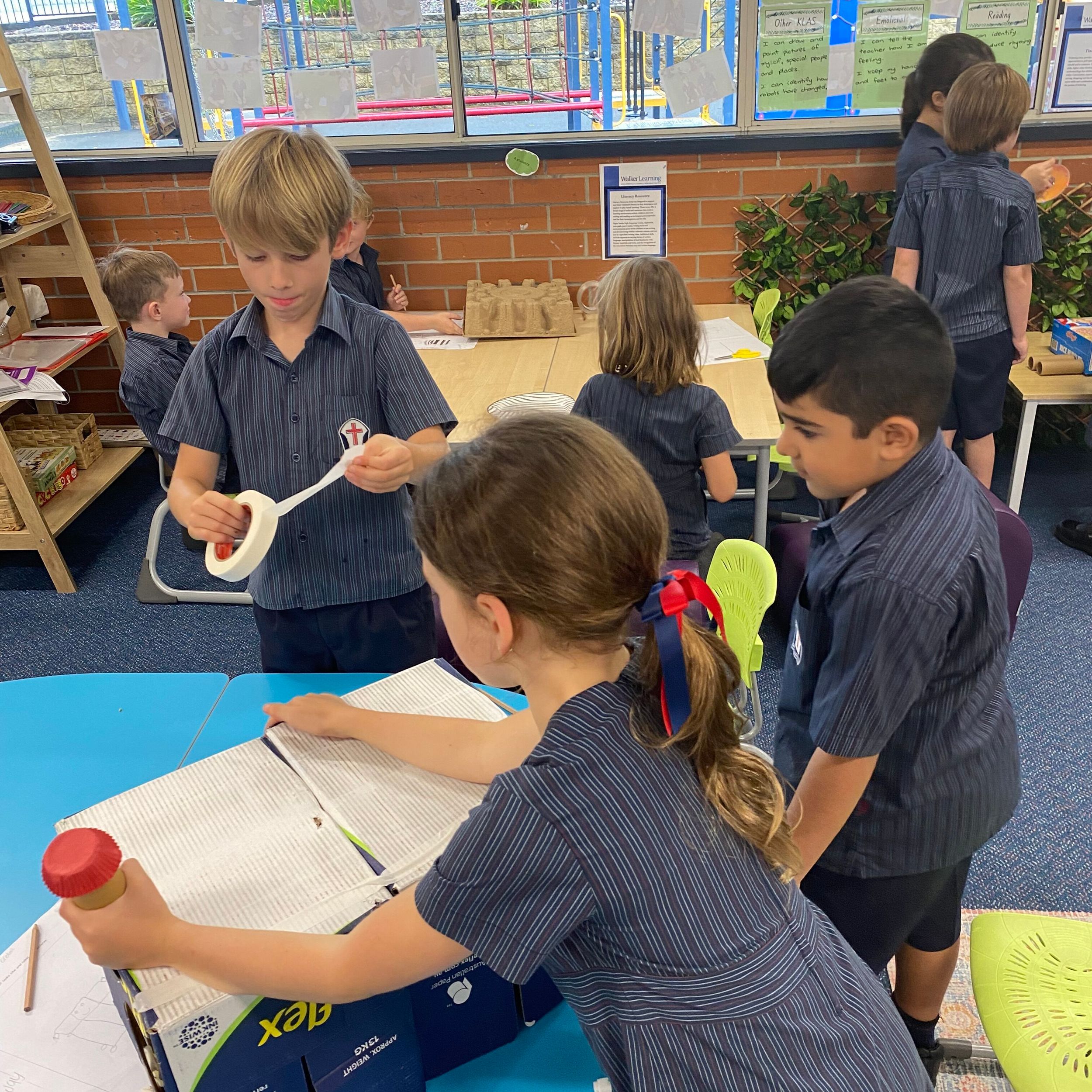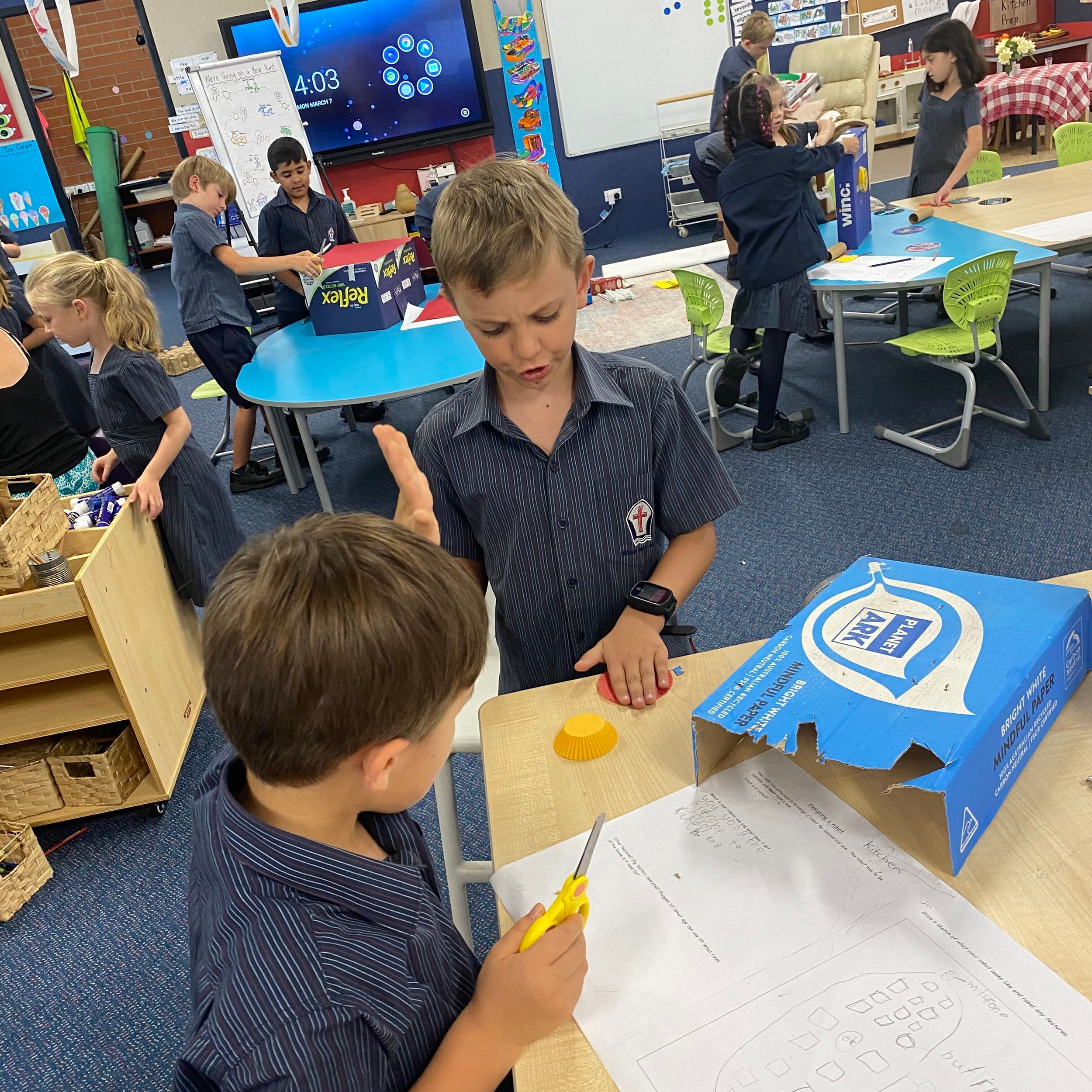 This term in the ELC we have been learning about change and innovation in Science lessons. We have worked in our buddy groups to design and make a robot to assist in different rooms of our houses. We had to work cooperatively and compromise whilst we were working on this project. We modified our design to improve it and also during the construction stage. It was a valuable and enjoyable experience for us all.