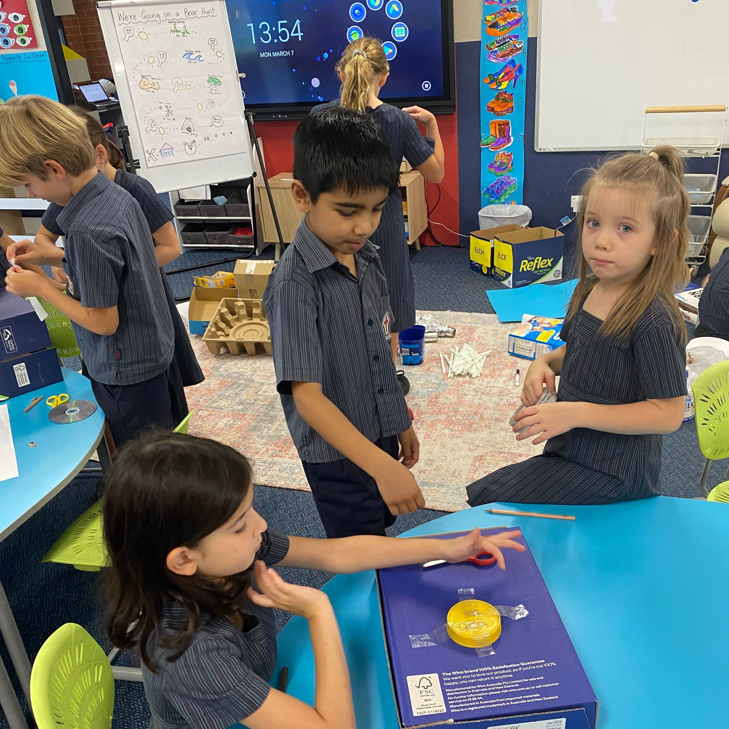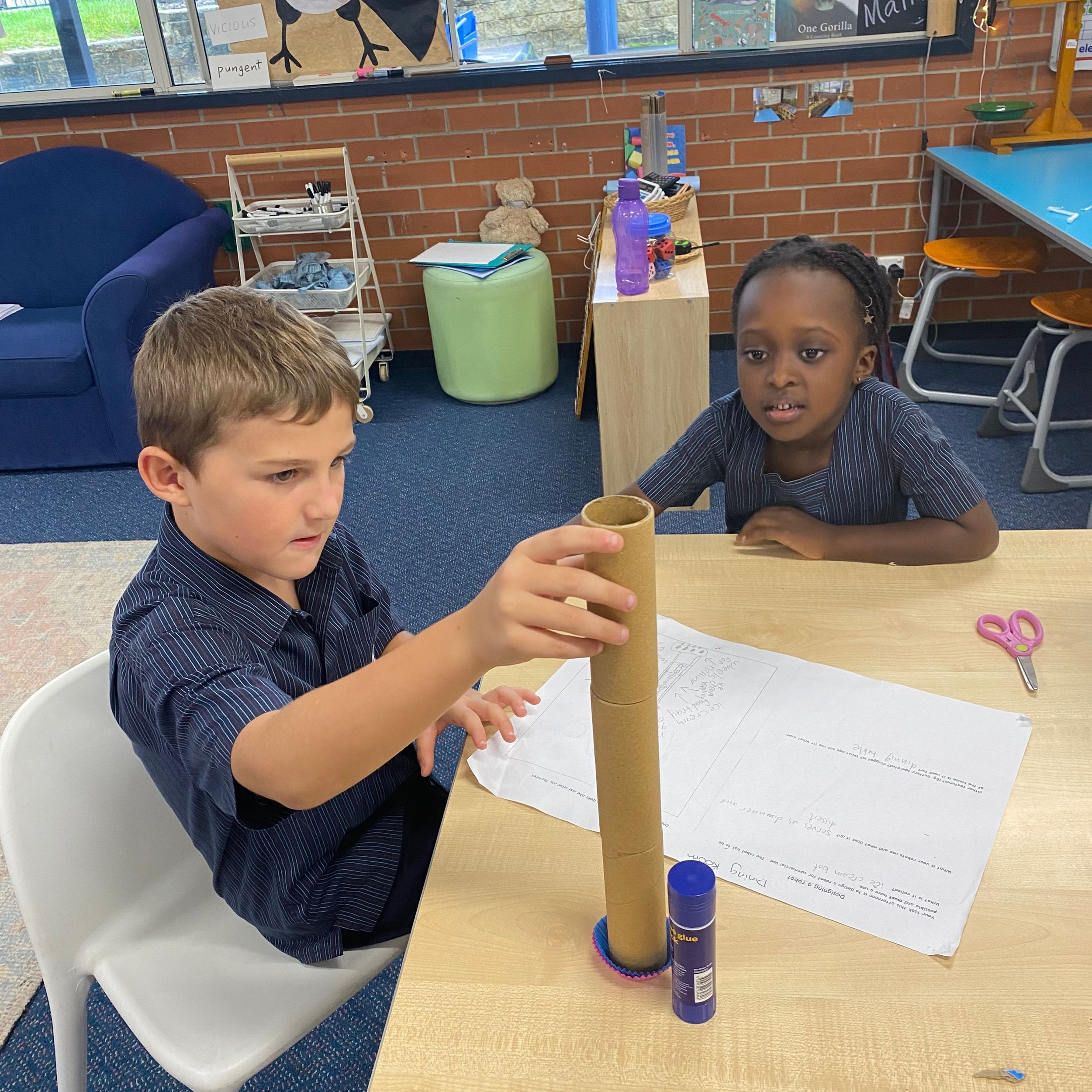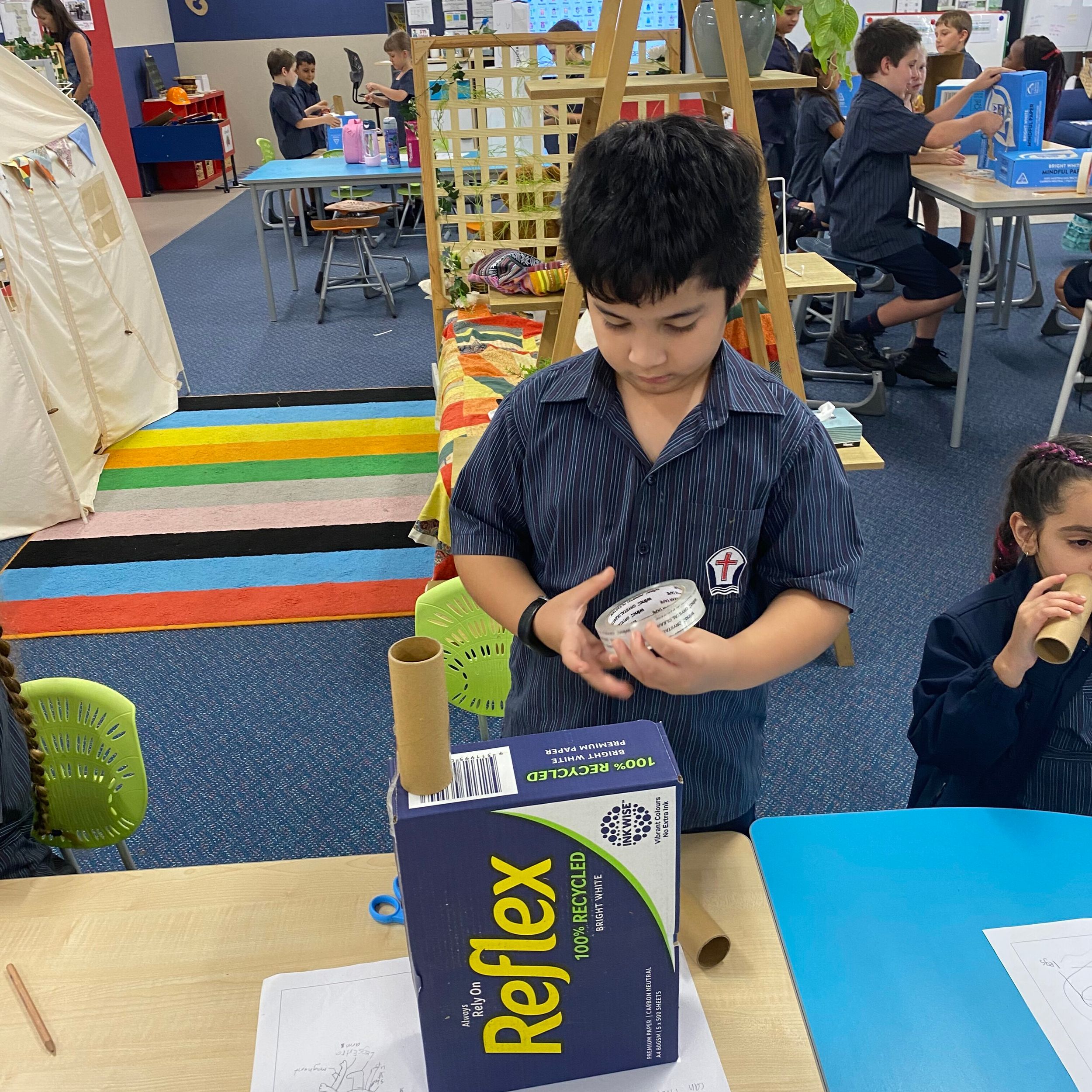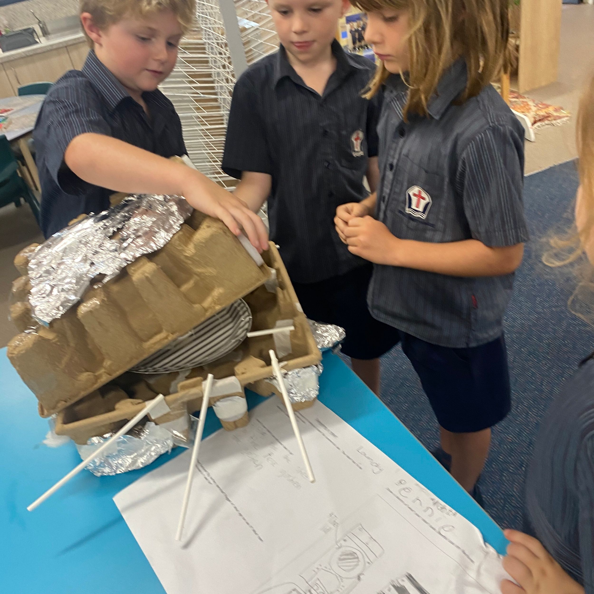 This term in the ELC we have been learning about change and innovation in Science lessons. We have worked in our buddy groups to design and make a robot to assist in different rooms of our houses. We had to work cooperatively and compromise whilst we were working on this project. We modified our design to improve it and also during the construction stage. It was a valuable and enjoyable experience for us all.