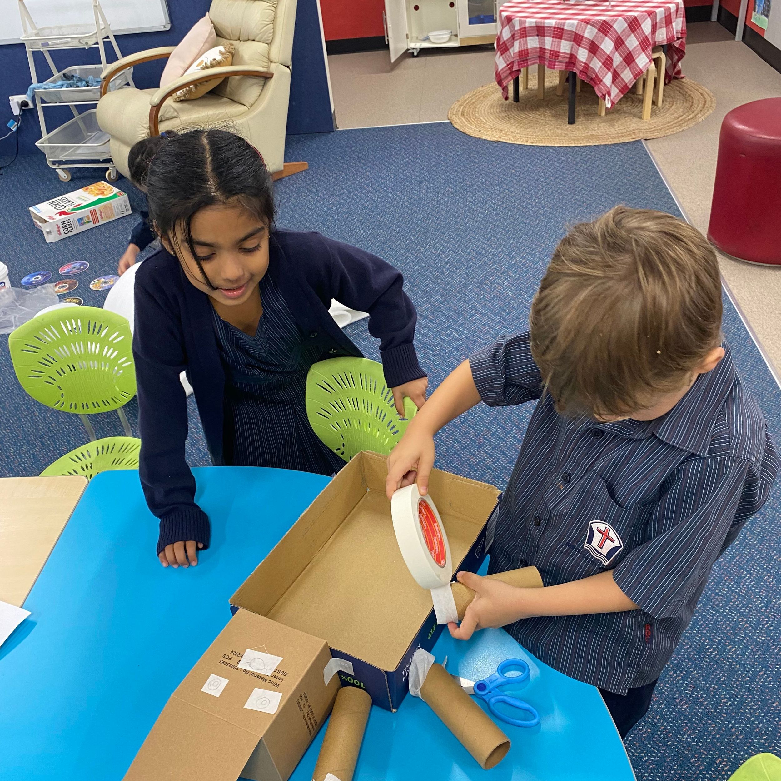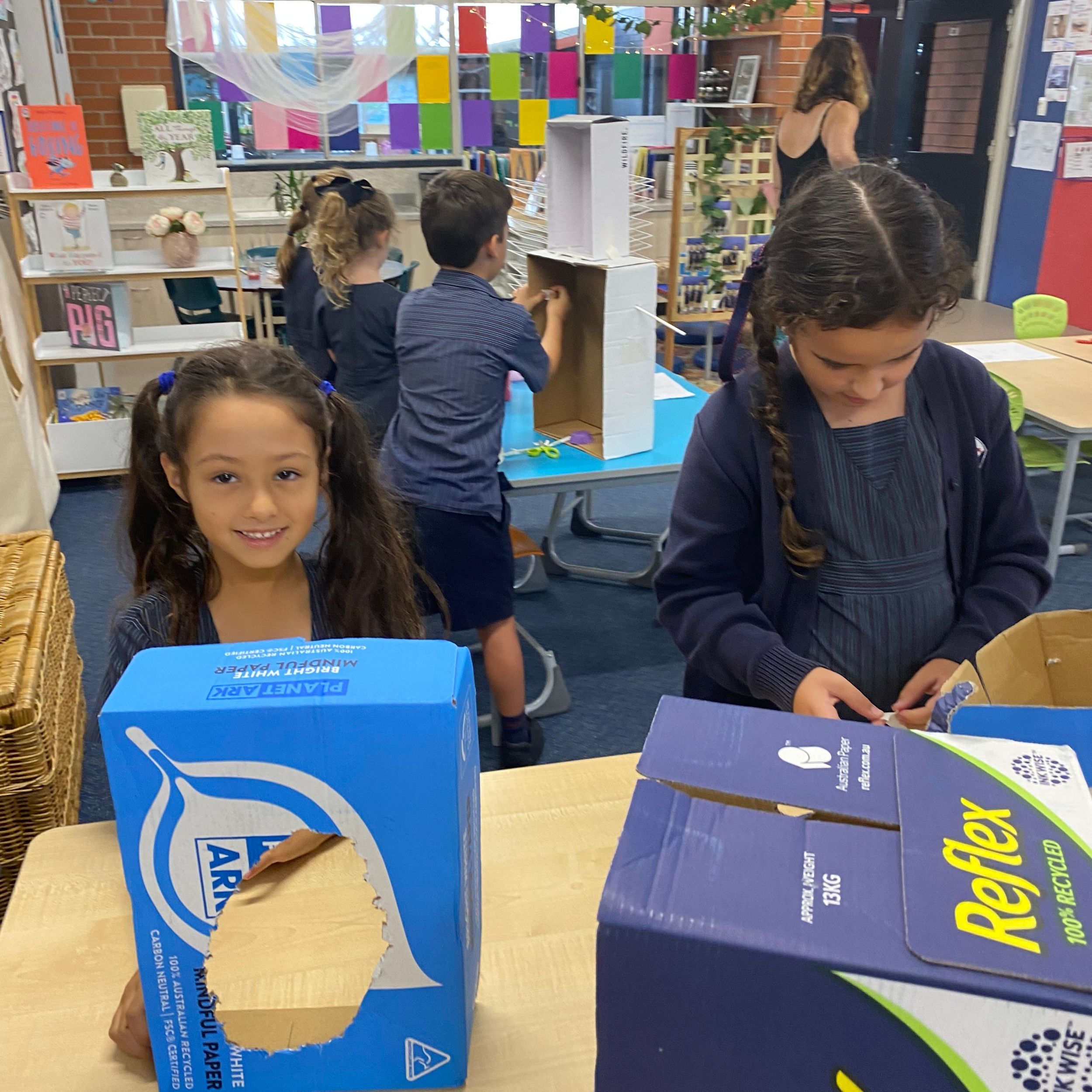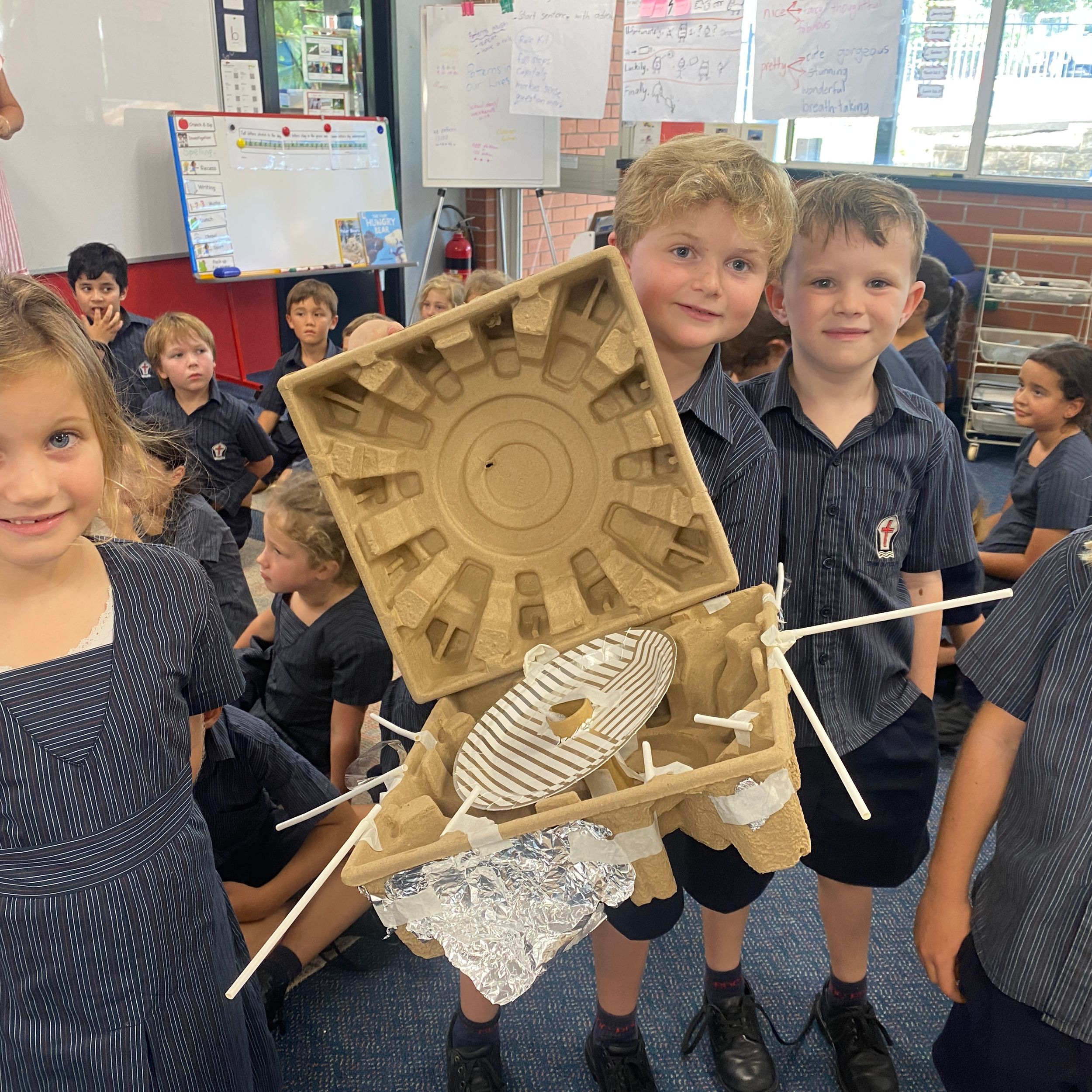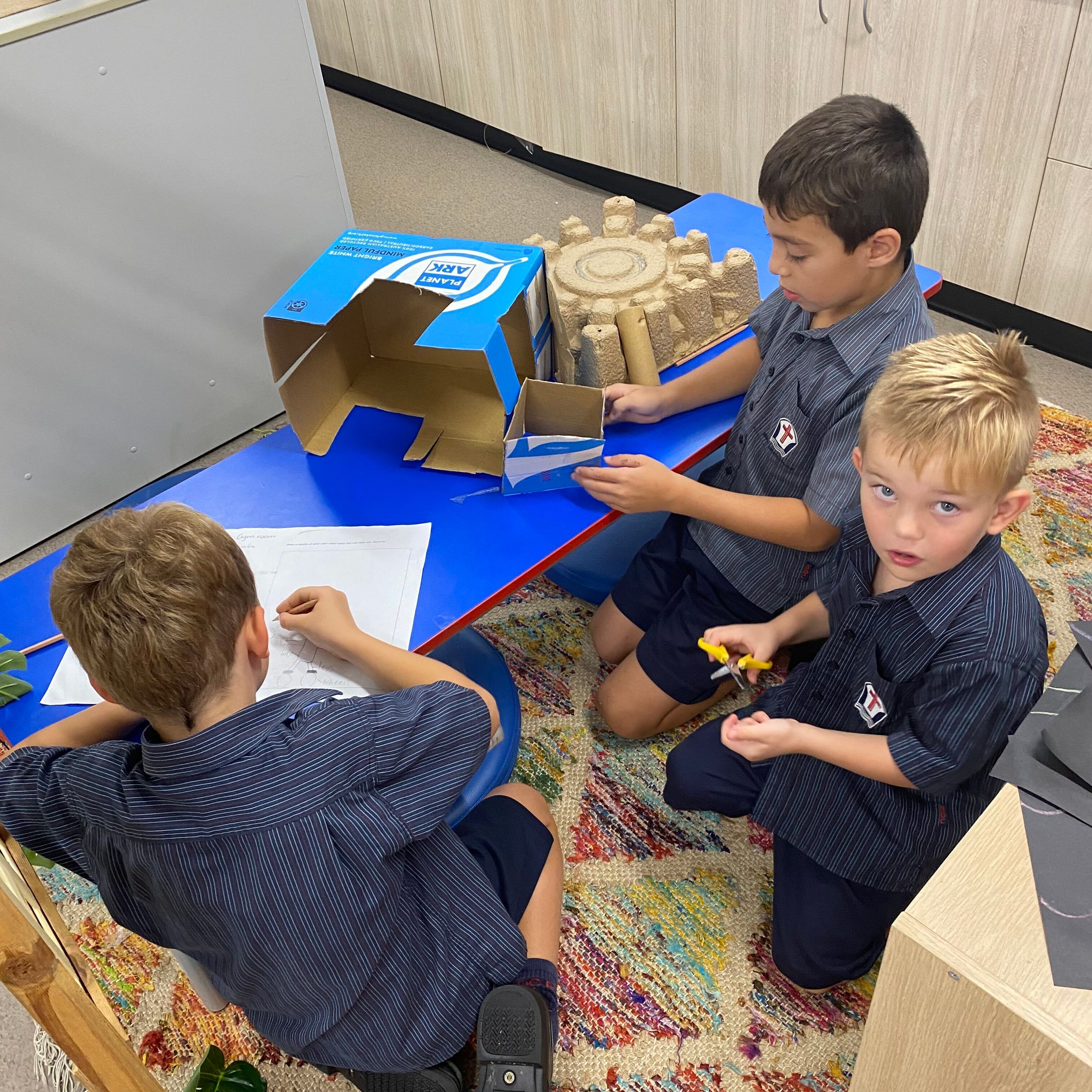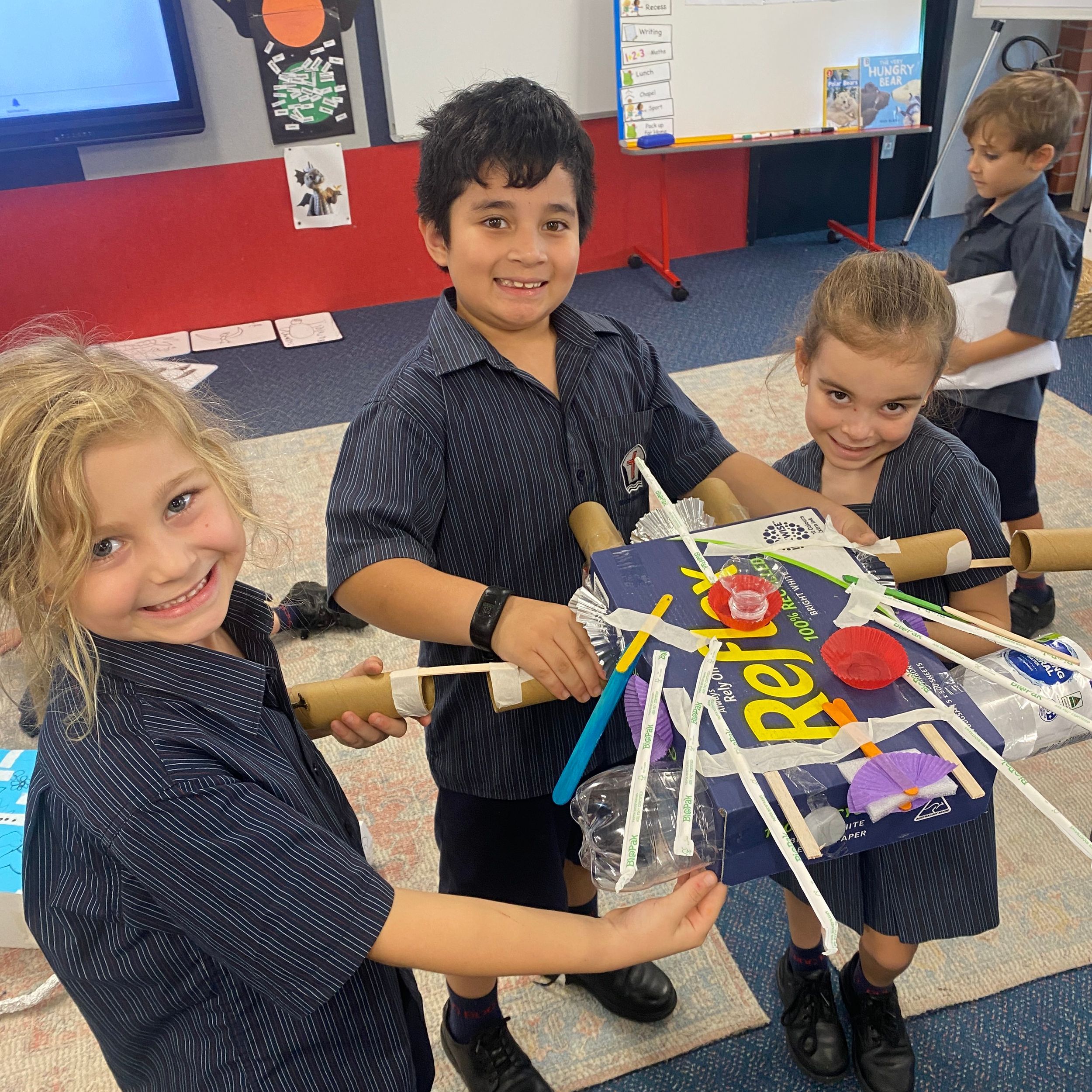 This term in the ELC we have been learning about change and innovation in Science lessons. We have worked in our buddy groups to design and make a robot to assist in different rooms of our houses. We had to work cooperatively and compromise whilst we were working on this project. We modified our design to improve it and also during the construction stage. It was a valuable and enjoyable experience for us all.