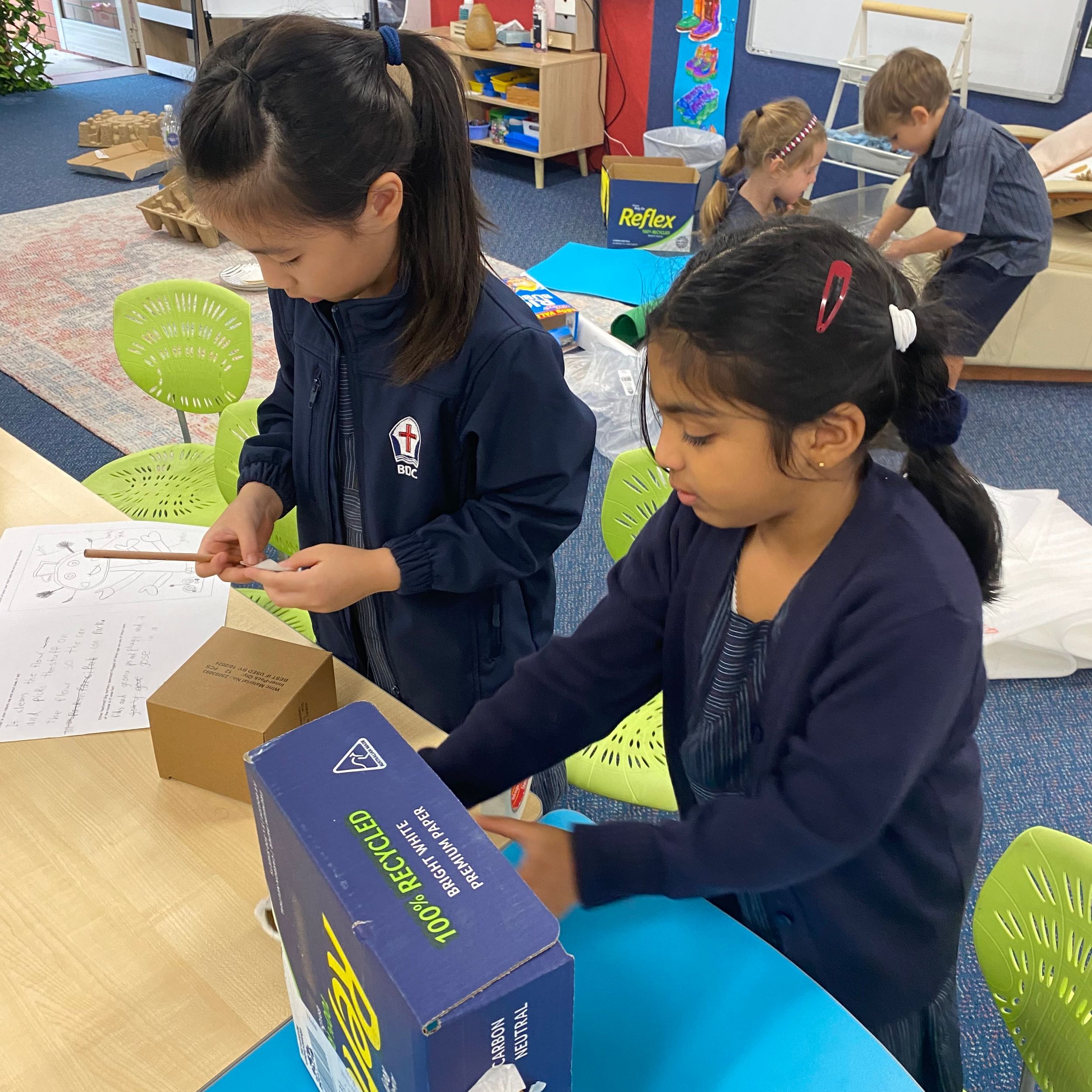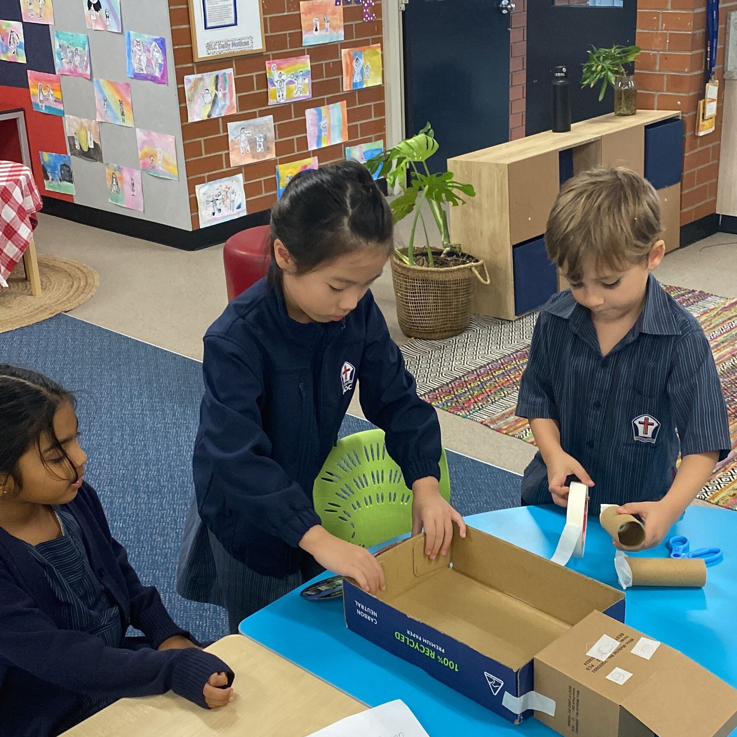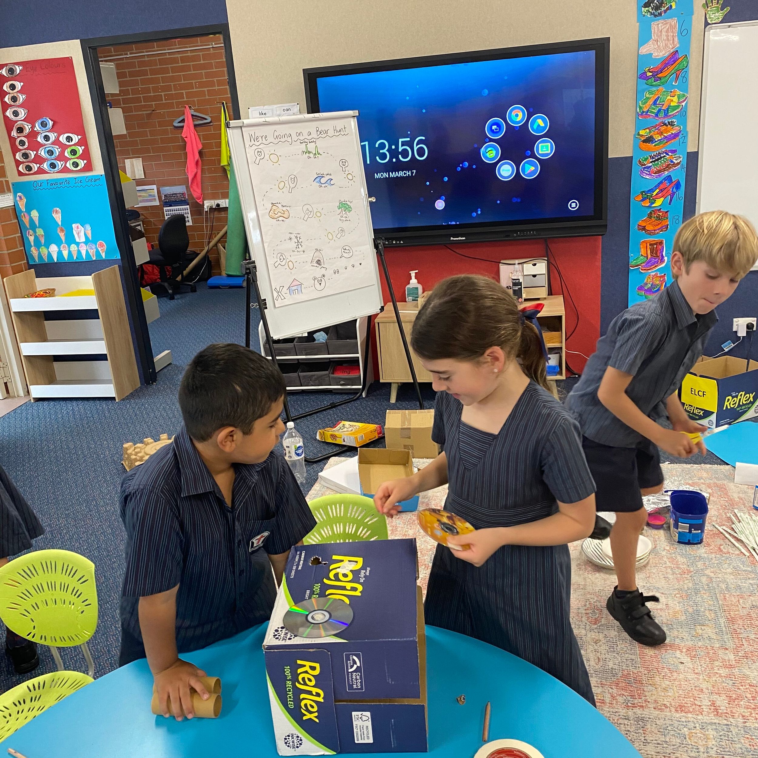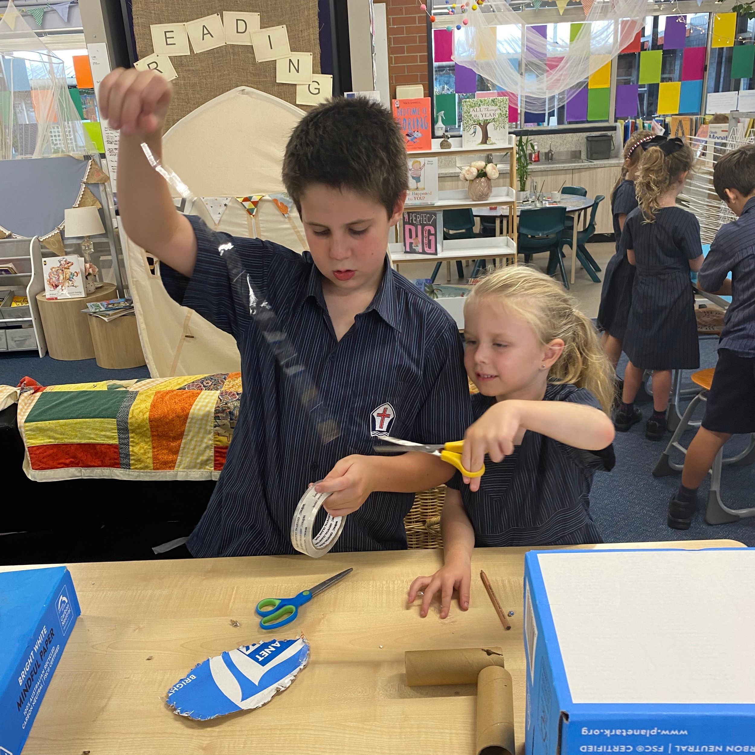 This term in the ELC we have been learning about change and innovation in Science lessons. We have worked in our buddy groups to design and make a robot to assist in different rooms of our houses. We had to work cooperatively and compromise whilst we were working on this project. We modified our design to improve it and also during the construction stage. It was a valuable and enjoyable experience for us all.