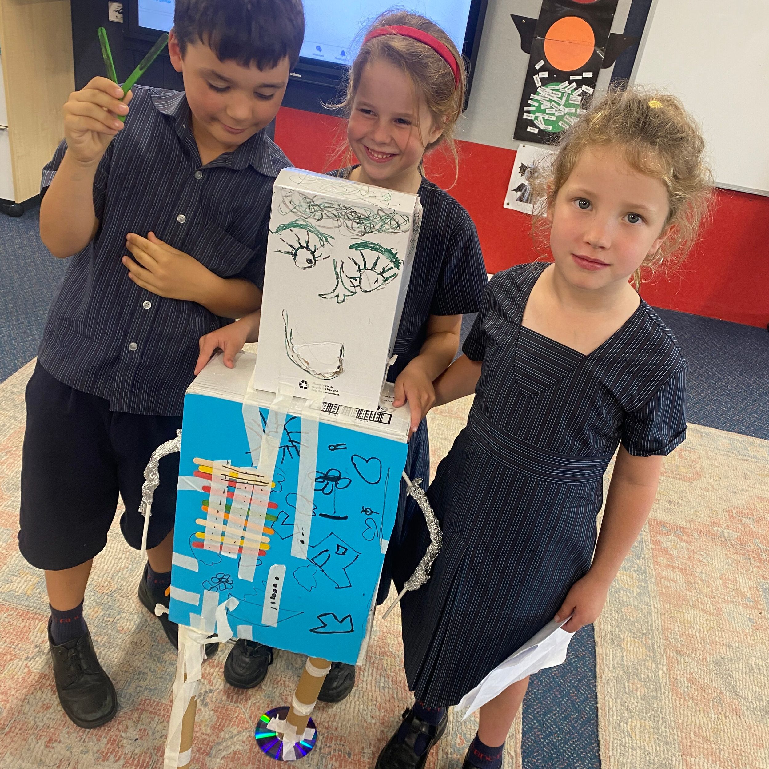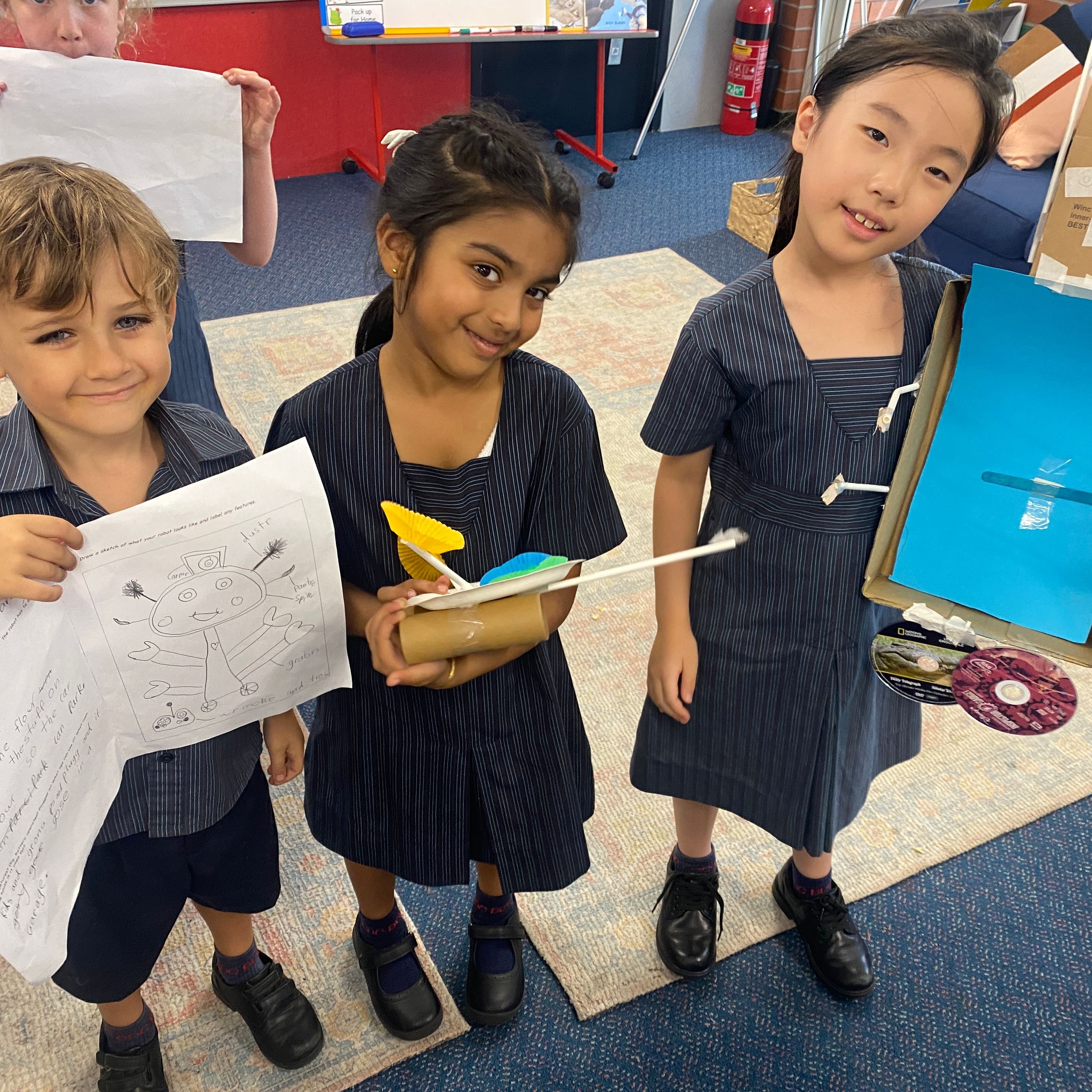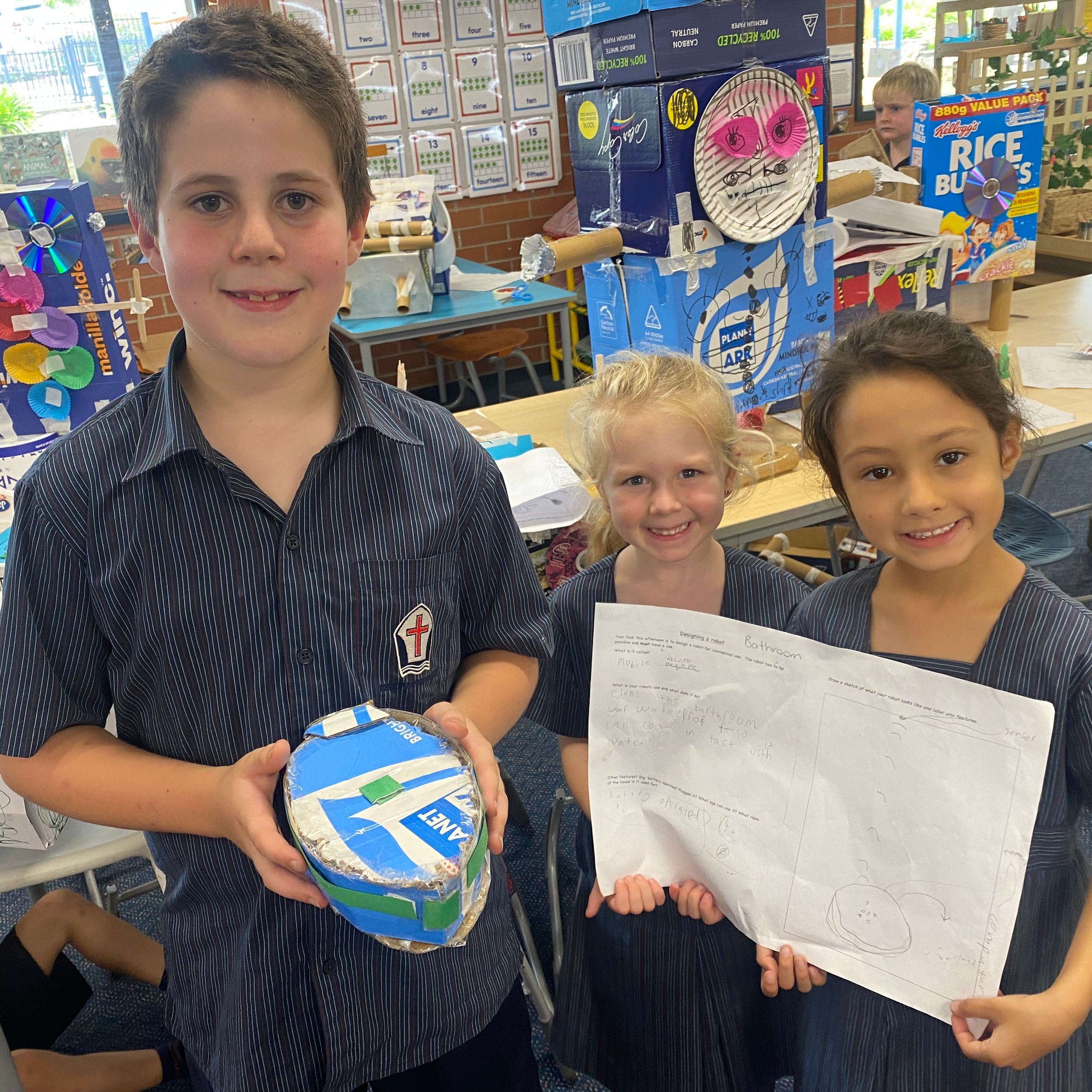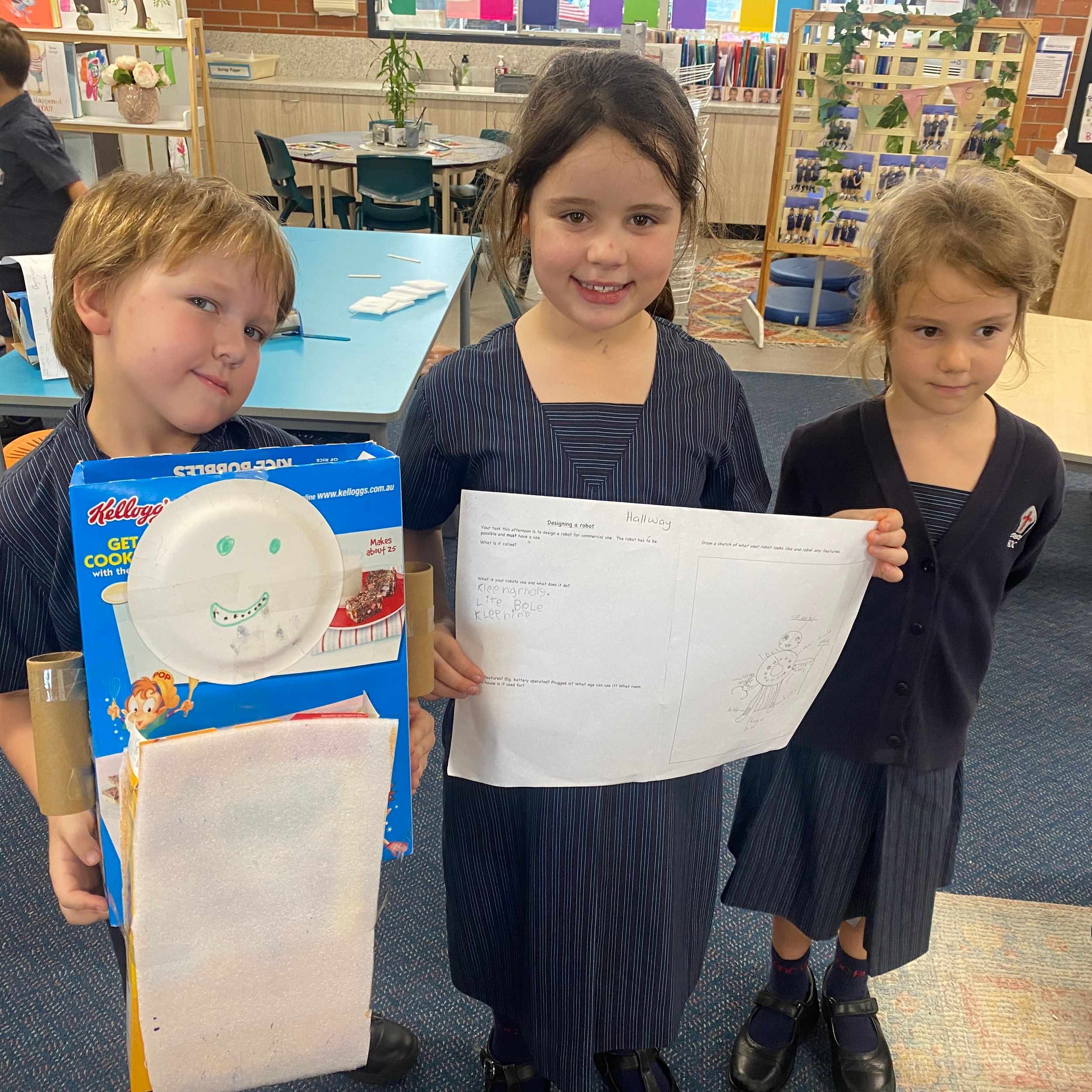 Thank you to Olivia’s mum, Mrs Miller who came to assist with the making phase. We also thank Mr Smith who enjoyed listening to our explanations of our robot designing and making and seeing our finished products.