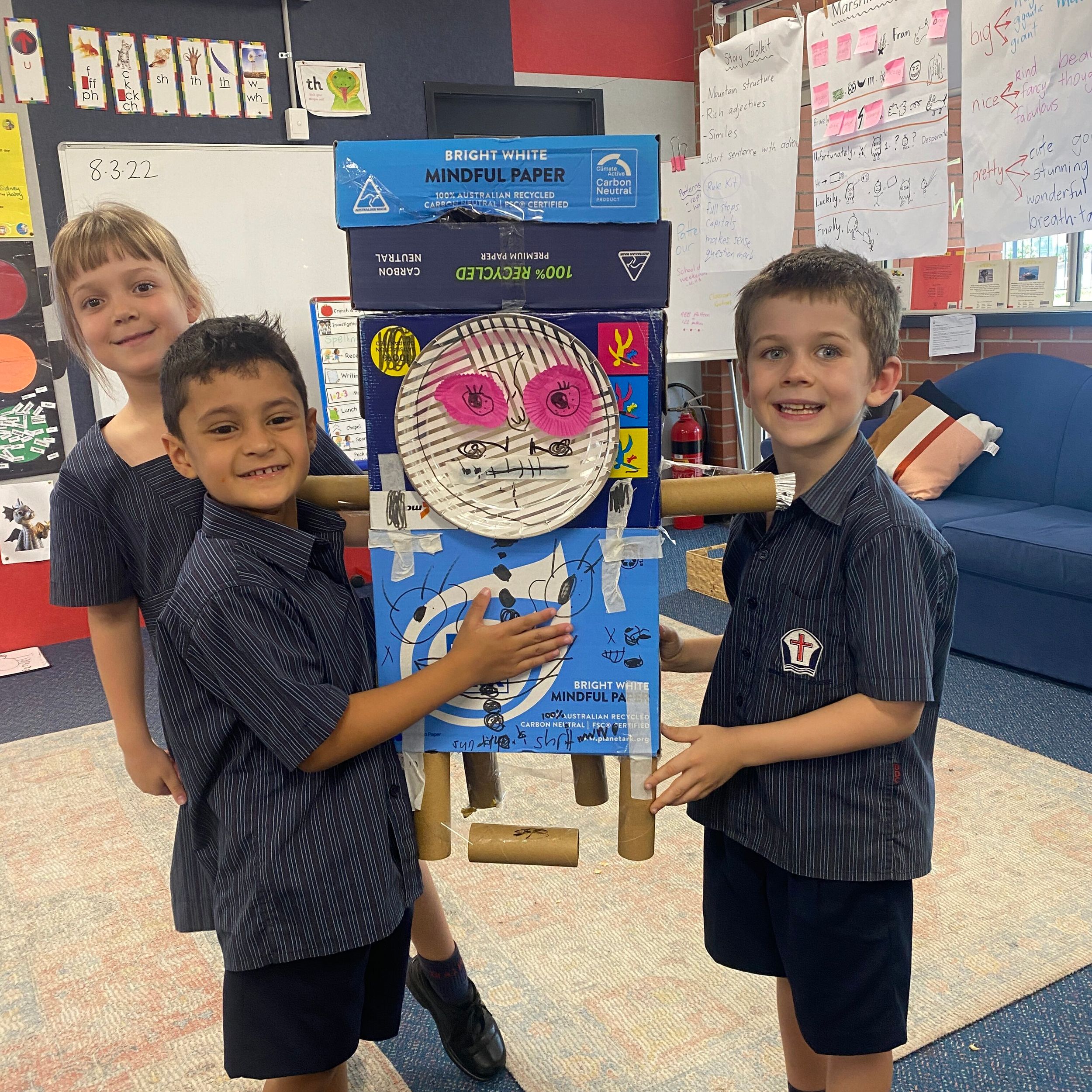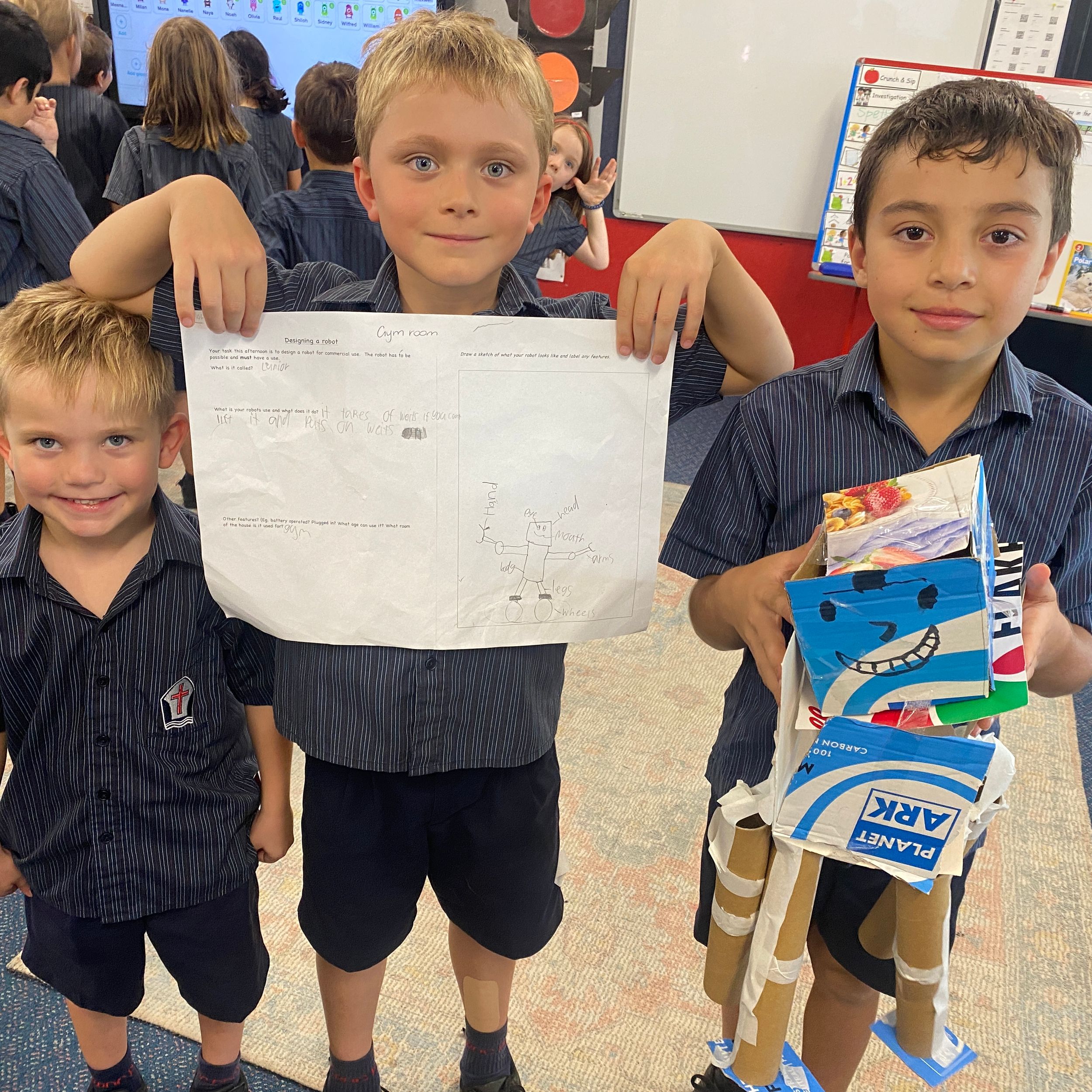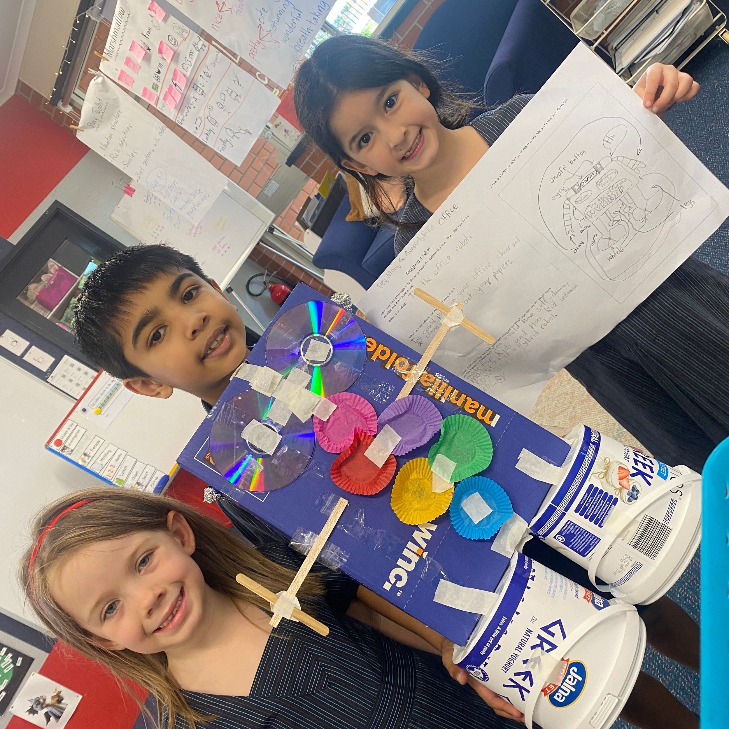 Thank you to Olivia’s mum, Mrs Miller who came to assist with the making phase. We also thank Mr Smith who enjoyed listening to our explanations of our robot designing and making and seeing our finished products.