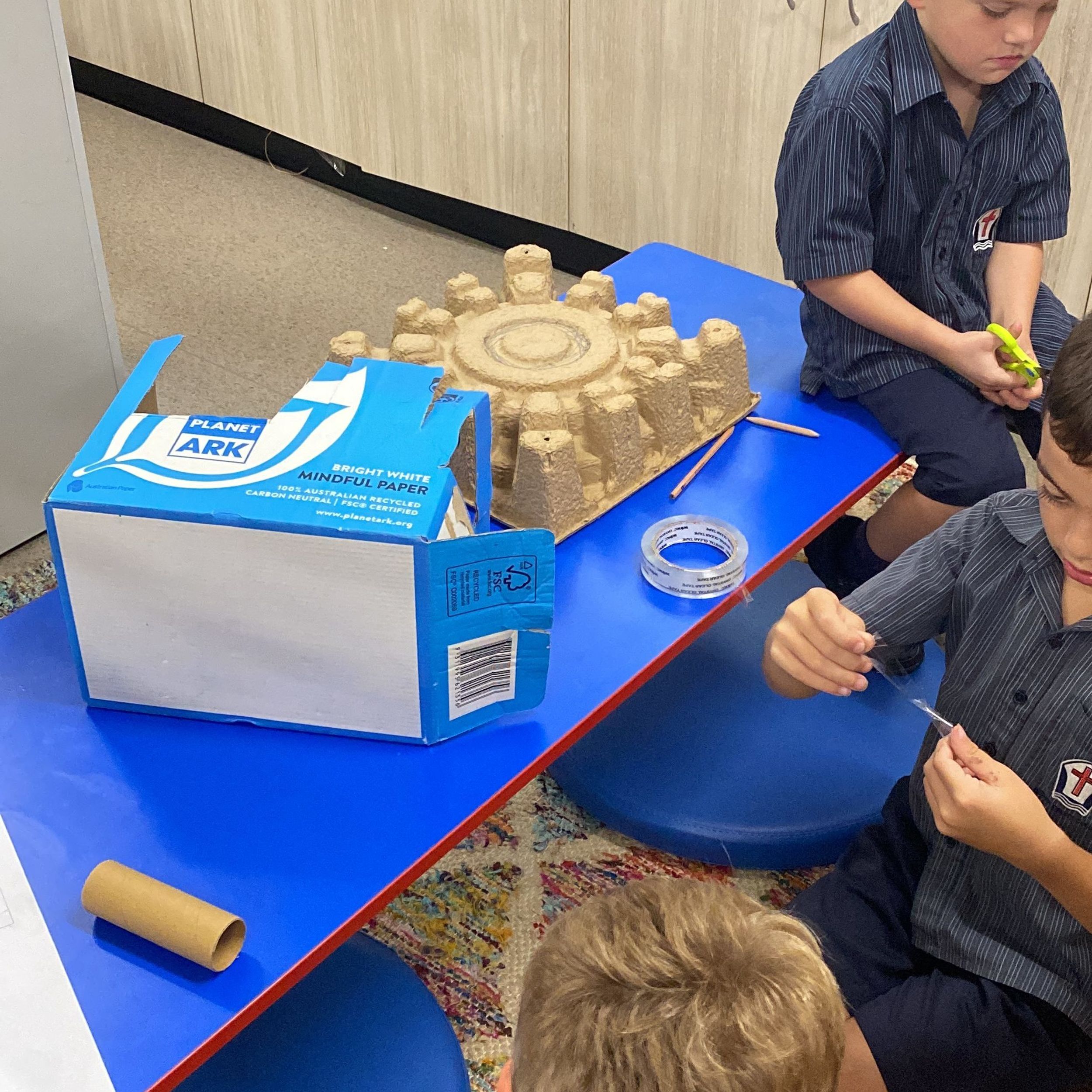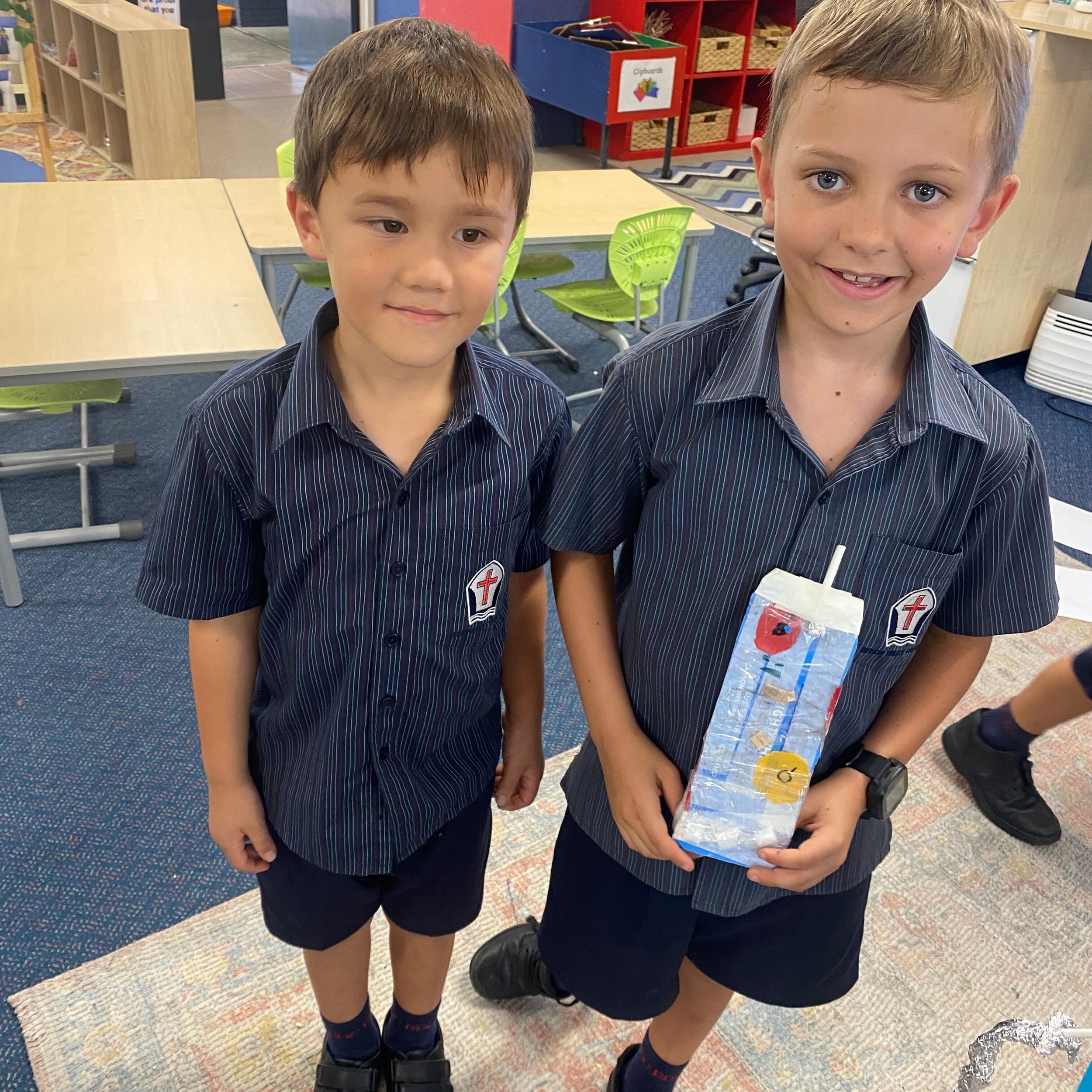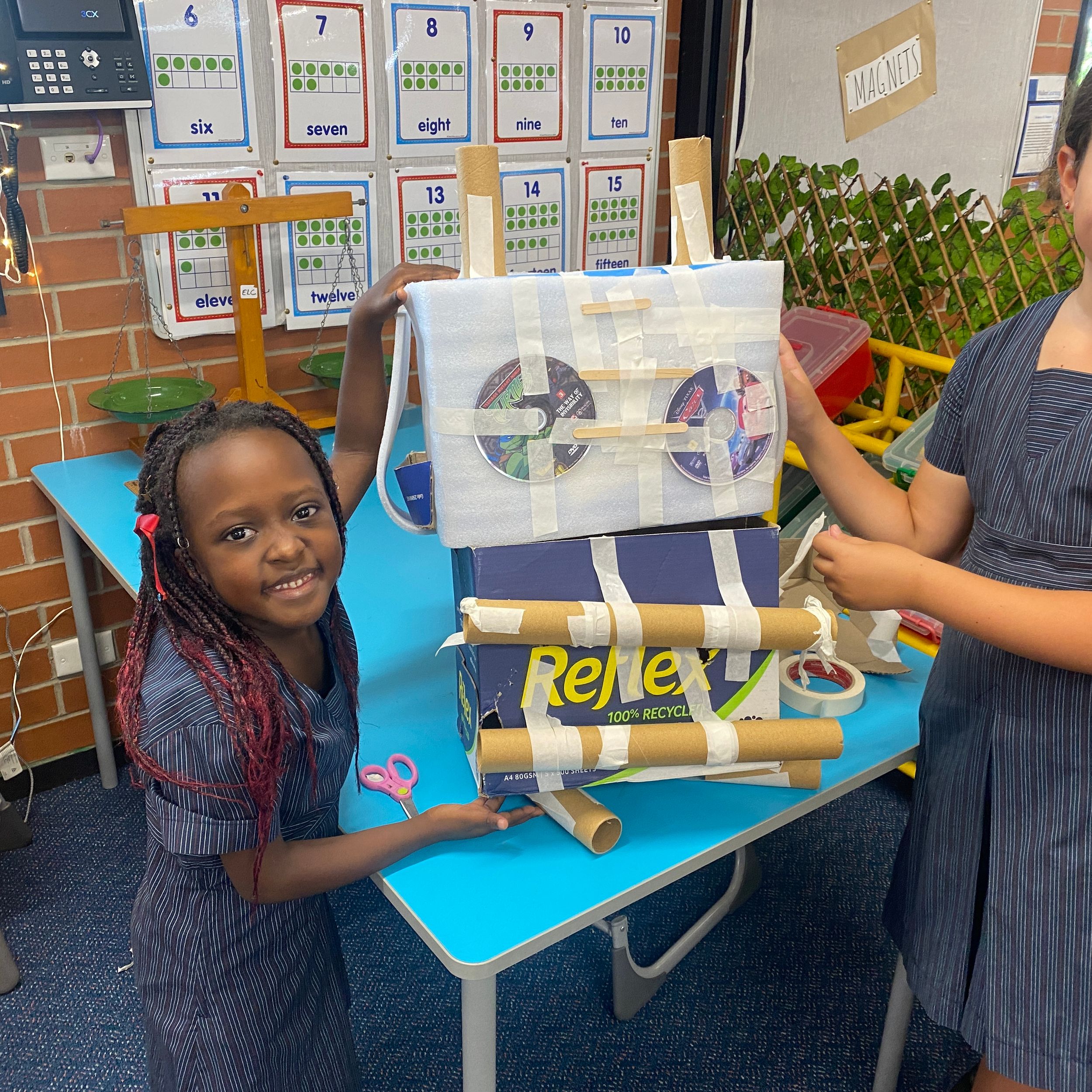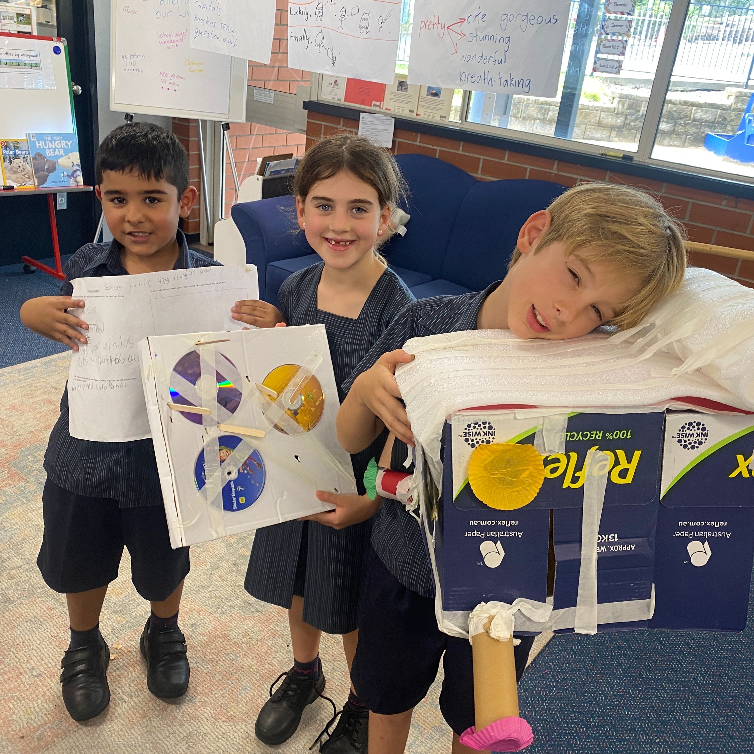 Thank you to Olivia’s mum, Mrs Miller who came to assist with the making phase. We also thank Mr Smith who enjoyed listening to our explanations of our robot designing and making and seeing our finished products.